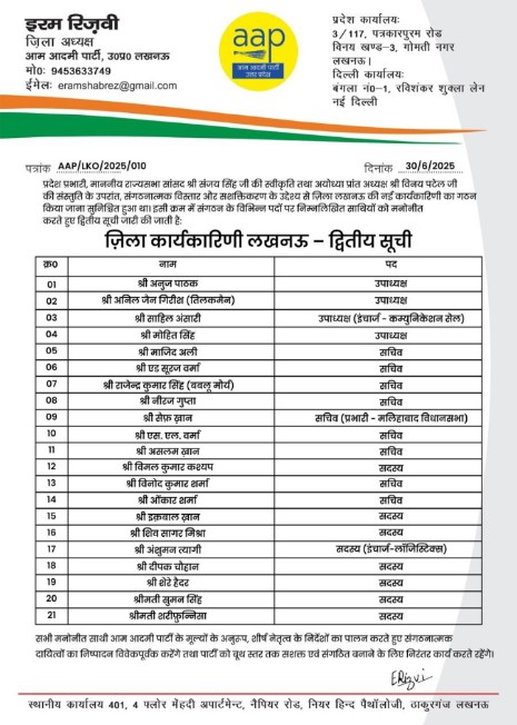 हर घर संपर्क अभियान से पहले आम आदमी पार्टी (AAP) की लखनऊ जिला अध्यक्ष इरम रिजवी ने कार्यकारिणी की दूसरी सूची जारी की। पार्टी के यूपी प्रभारी एवं राज्यसभा सांसद संजय सिंह की स्वीकृति तथा अयोध्या प्रांत अध्यक्ष विनय पटेल की संस्तुति के बाद यह सूची जारी की गई है। इससे पहले 18 सदस्यों की सूची जारी की जा चुकी है।