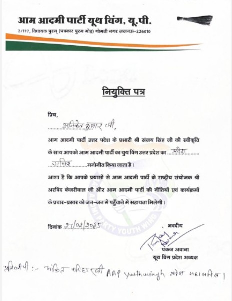 AAP UP यूथ विंग के सचिव बने अनिकेत चौधरी, जिम्मेदारी मिलने पर बोलें- ‘बेरोजगारी का मुद्दा सड़क से लेकर सदन तक उठाऊंगा’