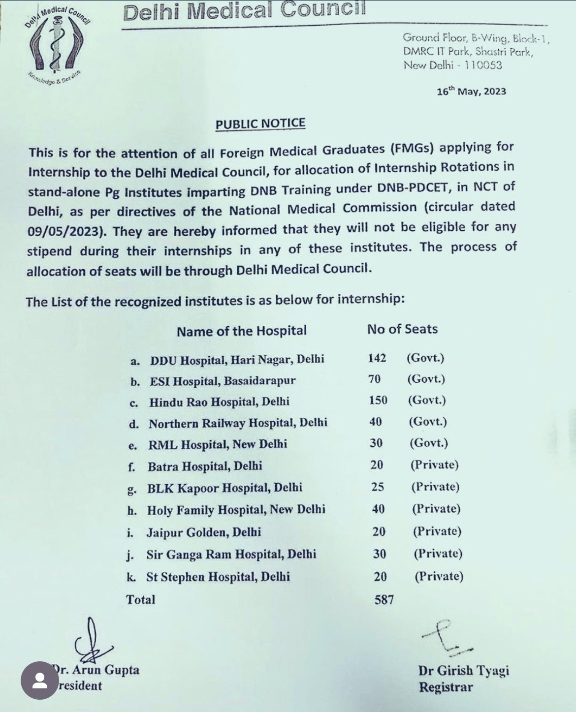 Delhi Medical Council releases a list of recognised institutes for #FMG internship. A total of 587 seats are now available!