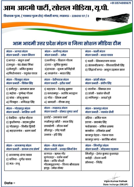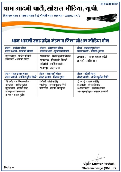 आम आदमी पार्टी (AAP) ने उत्तर प्रदेश की मंडल व जिले की सोशल मीडिया टीम घोषित कर दी है। प्रदेश प्रभारी व राज्यसभा सांसद संजय सिंह ने सभी साथियों को बधाई दी है।