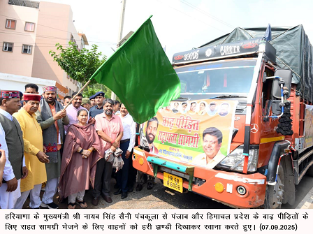 हरियाणा के मुख्यमंत्री नायब सिंह सैनी ने रविवार को भाजपा प्रदेश कार्यालय (पंचकमल), पंचकूला से बाढ प्रभावित पंजाब व हिमाचल प्रदेश के लिए सहायता सामग्री के 25 ट्रकों को झंडी दिखाकर रवाना किया। इनमें 15 ट्रक पंजाब के लिए और 10 ट्रक हिमाचल प्रदेश के लिए शामिल हैं। इससे पहले मुख्यमंत्री ने माता मनसा देवी मंदिर में पूजा अर्चना की और महामायी का आशीर्वाद लिया।