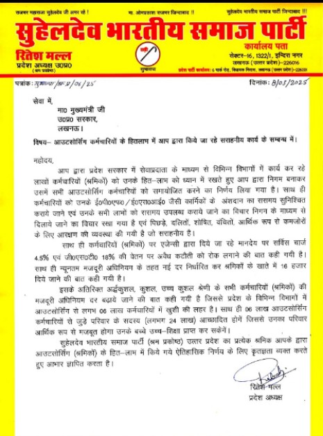 निगम बनाकर समायोजित किये जाएंगे आउटसोर्स कर्मी, सुभासपा श्रम प्रकोष्ठ अध्यक्ष ने सीएम योगी का जताया आभार