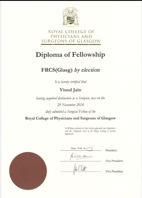 Indinewsline, Lucknow: KGMU के पूर्व डॉ. विनोद जैन को सर्जरी में उत्कृष्टता के लिए रॉयल कॉलेज ऑफ सर्जन्स ग्लास्गो की ओर से फेलोशिप FRCS प्रदान की गई है। इससे पहले भी उन्हें रॉयल कॉलेज ऑफ इंडियन बैंक की ओर से पिछले साल ही FRCS मिल चुकी है।