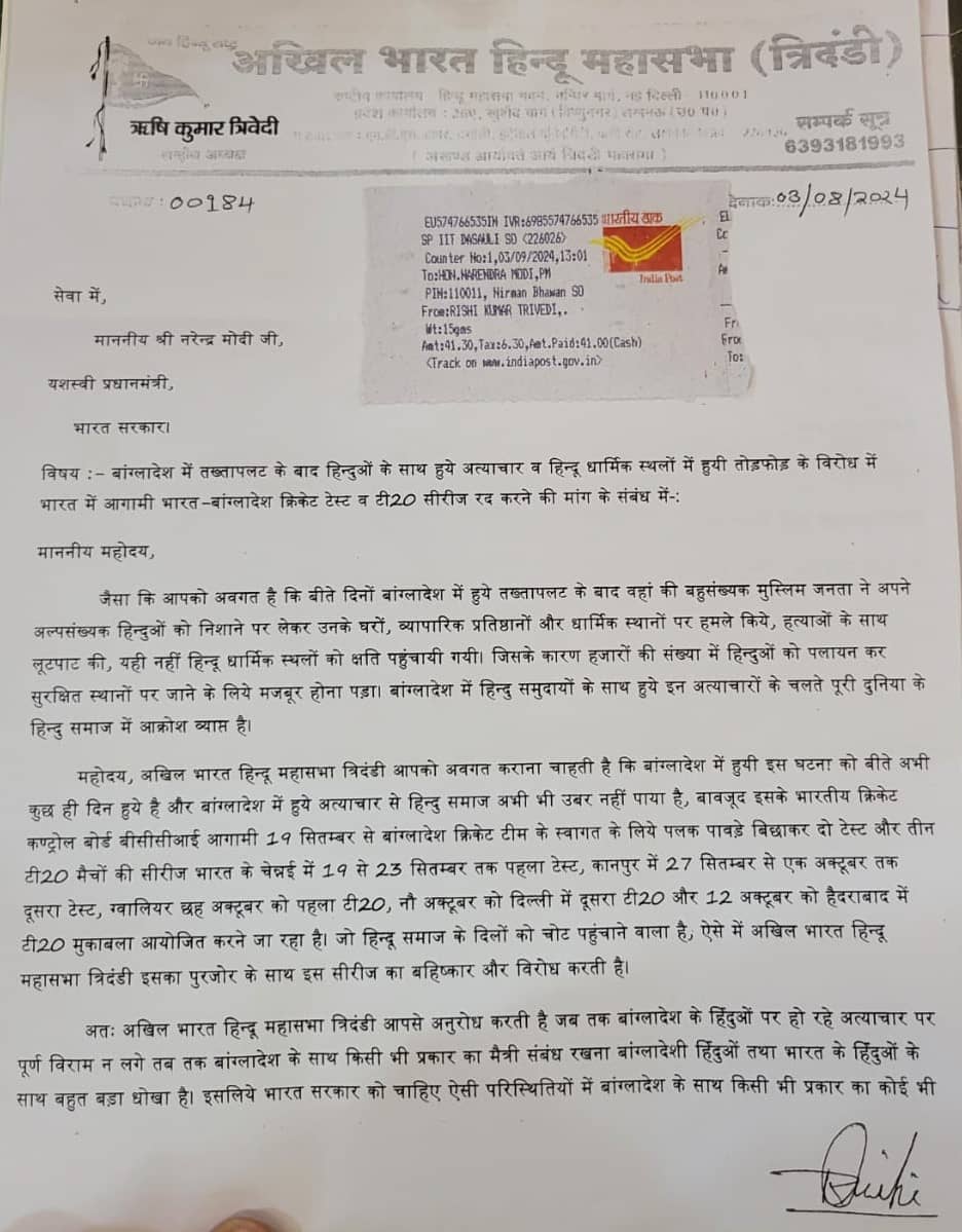 बांग्लादेश में तख्तापलट के बाद वहां हिन्दुओं के साथ हुये अत्याचार व हिन्दू धार्मिक स्थलों में हुयी तोड़फोड़ के विरोध में अखिल भारत हिन्दू महासभा ‘त्रिदंडी’ ने भारत में आगामी भारत-बांग्लादेश क्रिकेट टेस्ट व टी20 सीरीज रद्द करने की मांग की है। प्रधानमंत्री नरेन्द्र मोदी से यह मांग की गई है।
