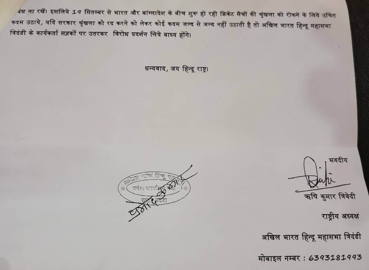 इसलिये 19 सितम्बर से भारत और बांग्लादेश के बीच शुरू हो रही क्रिकेट मैचों की श्रृंखला को रोकने के लिये उचित कदम उठाये, यदि सरकार श्रृंखला को रदद् करने को लेकर कोई कदम जल्द से जल्द नहीं उठाती है तो अखिल भारत हिन्दू महासभा ‘त्रिदंडी’ के कार्यकर्ता सड़कों पर उतरकर विरोध प्रदर्शन लिये बाध्य होंगे।