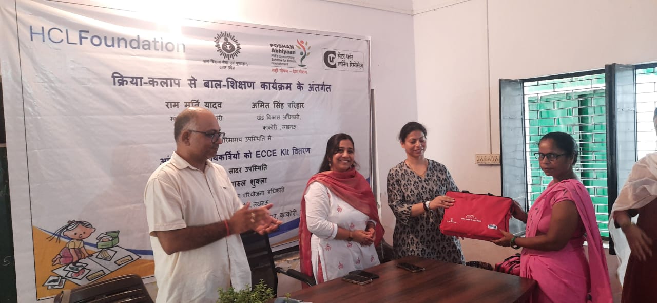 लखनऊ। काकोरी की CDPO पारुल शुक्ला ने पहिया आजमपुर पंचायत भवन सभागार में 30 आंगनबाड़ी कार्यकत्रियों को ECCE किट का वितरण किया। किट का निर्माण HCL फाउंडेशन और सेन्टर फ़ॉर लर्निंग रिसोर्सेज CLR पुणे द्वारा किया गया है। फाउंडेशन व ICDS की भागीदारी से संचालित “क्रियाकलाप से बाल- शिक्षण” कार्यक्रम के तहत यह कार्यक्रम आयोजित किया गया।