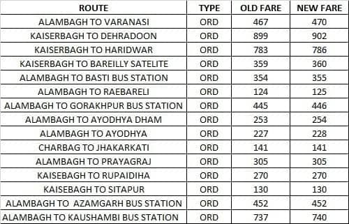 लखनऊ से कई मार्गों पर रोडवेज बसों का किराया नहीं बढ़ा। इनमें आलमबाग से प्रयागराज किराया 305 रुपये, इसी प्रकार चारबाग से कानपुर 141, कैसरबाग से रूपईडिहा 270, कैसरबाग से सीतापुर 130 और आलमबाग से आजमगढ़ 452 रुपये साधारण बसों का किराया जस का तस रहेगा। इन रूटों पर साधारण बसों में किराये में कोई बदलाव नहीं किया गया है।
