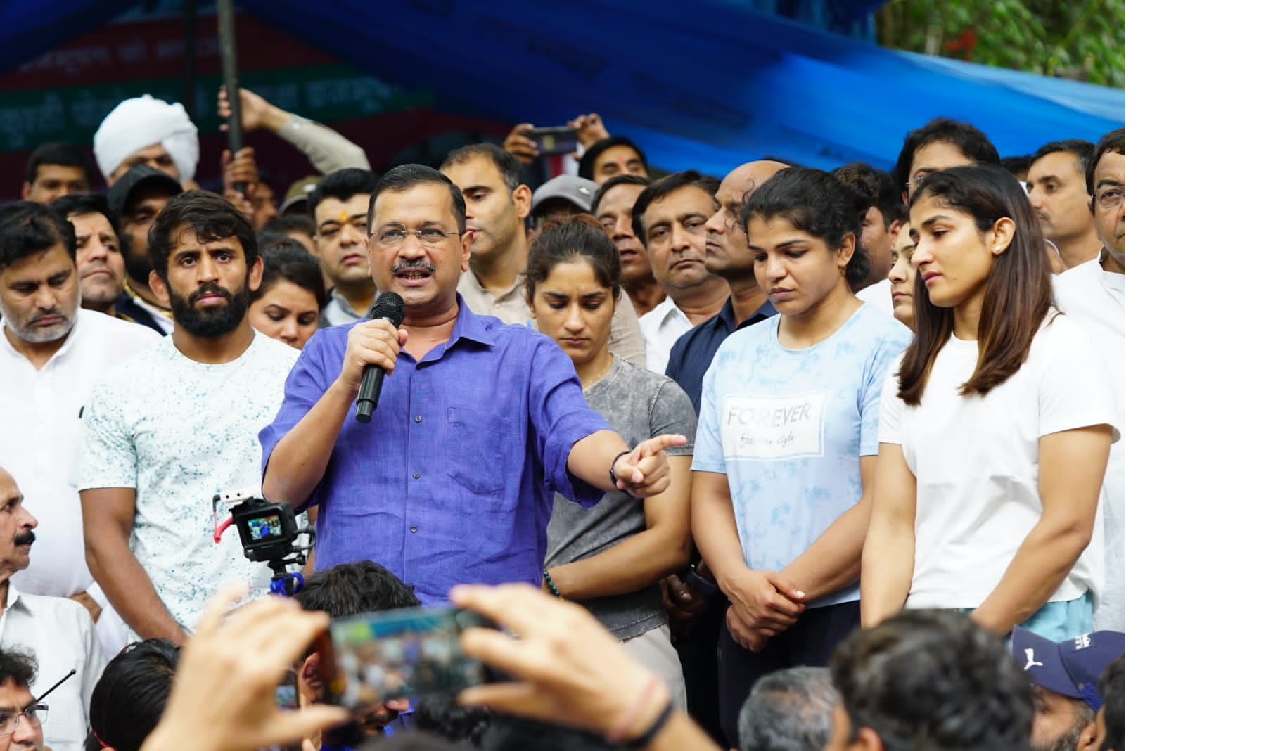 आम आदमी पार्टी के राष्ट्रीय संयोजक व दिल्ली के मुख्यमंत्री अरविंद केजरीवाल शनिवार को जंतर-मंतर पर पहुंचे और कई दिनों से धरना दे रहे खिलाड़ियों के संघर्ष में शामिल हुए और पूरे देश से इनका साथ देने की अपील की। उन्होंने कहा कि जो लोग भारत मां सेे प्यार करते हैं, वे सभी इनको समर्थन देने जंतर-मंतर जरूर पहुंचे, भले ही एक-दो दिन की छुट्टी लेनी पड़े। ये बच्चियां अपने लिए नहीं, बल्कि खेल जगत के लिए लड़ रही हैं। उन्होंने दुख जताते हुए कहा कि पूरी दुनिया में भारत का नाम रौशन करने वाली इन बेटियों को पूरे देश ने कंधे पर उठाया था, लेकिन आज इनको छेड़खानी करने वाले व्यक्ति के खिलाफ एक एफआईआर कराने के लिए धरना देना पड़ रहा है। प्रधानमंत्री ने ग़रीबों के बच्चों को पढ़ाने वाले को जेल में डाल दिया और महिला खिलाड़ियों का शोषण करने वाले को गले से लगा लिया।