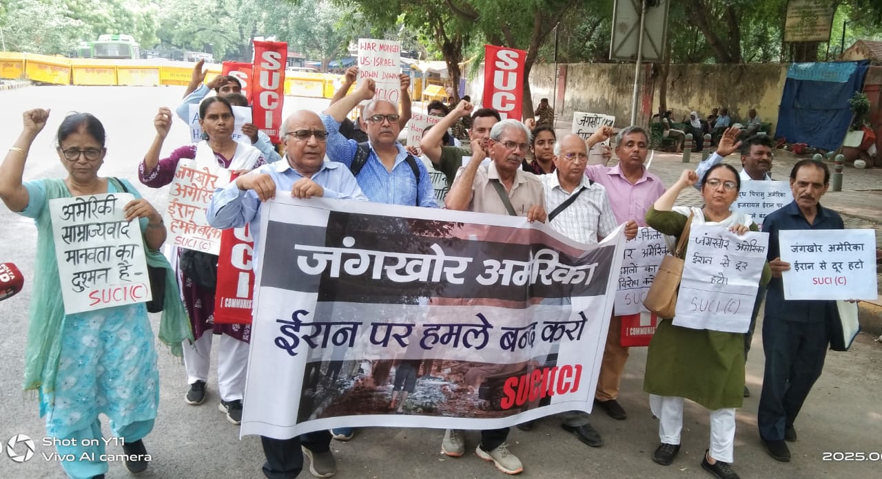 सोशलिस्ट यूनिटी सेंटर ऑफ इंडिया (कम्युनिस्ट), एसयूसीआई (सी), दिल्ली राज्य कमेटी ने जंतर मंतर पर विरोध प्रदर्शन कर ईरानी परमाणु संयंत्रों पर संयुक्त राज्य अमेरिका के हालिया आक्रामक सैन्य कार्यवाहियों की कड़े शब्दों में निंदा की।