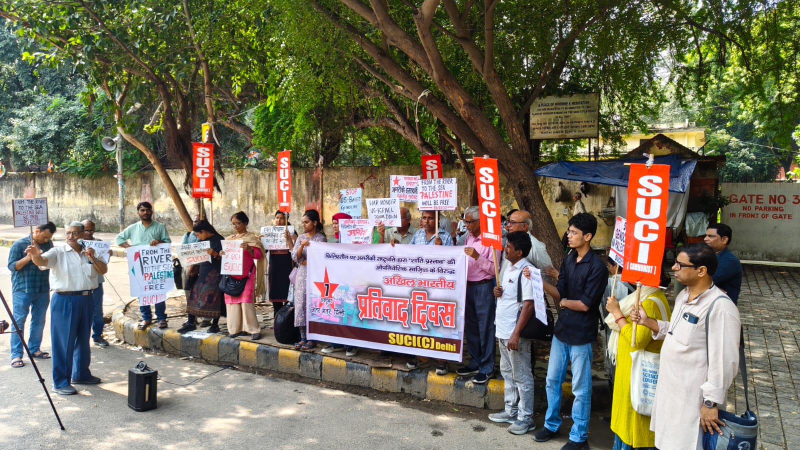सोशलिस्ट यूनिटी सेंटर ऑफ इंडिया (कम्युनिस्ट) [एसयूसीआई(सी)] की दिल्ली राज्य समिति ने मंगलवार को जंतर-मंतर पर अमेरिकी राष्ट्रपति डोनाल्ड ट्रम्प की तथाकथित ‘फिलिस्तीन शांति योजना’ के खिलाफ जोरदार प्रदर्शन किया।