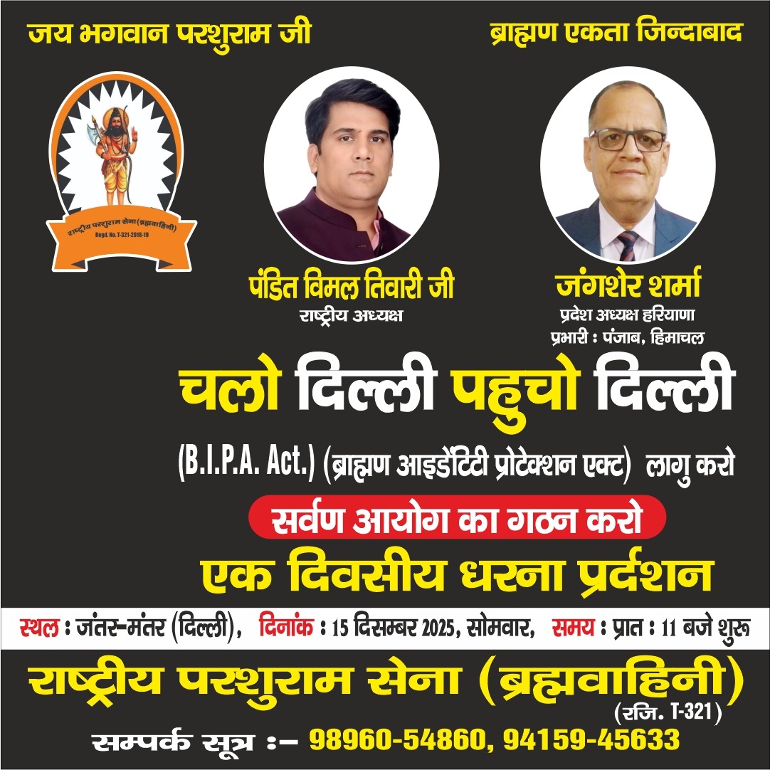 परशुराम सेना ब्रह्म वाहिनी के राष्ट्रीय अध्यक्ष पंडित विमल तिवारी जी की अध्यक्षता में संगठन 15 दिसंबर को जंतर-मंतर पर विरोध प्रदर्शन करेगा। इसमें संगठन के दिल्ली प्रदेश पदाधिकारी, ट्रस्ट सदस्य और कई वरिष्ठ धार्मिक-सामाजिक प्रतिनिधि शामिल होंगे।
