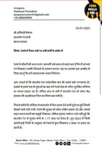 यह बातें युवा हल्ला बोल के राष्ट्रीय अध्यक्ष अनुपम ने रेल मंत्री अश्विनी वैष्णव को लिखे पत्र में कहा है। अनुपम संयुक्त युवा मोर्चा के संस्थापक सदस्य भी हैं। उन्होंने रेल मंत्री को टैग करते हुए पत्र को ट्वीट भी किया है। अनुपम ने कहा कि रेलवे में नौकरी की आस लगाए अभ्यर्थी लंबे समय से कहते आए हैं कि मैं आपको पत्र लिखकर उनकी चिंताओं से अवगत कराऊं। यह पत्र आपको इस उम्मीद में लिख रहा हूं कि हमें सकारात्मक जवाब मिलेगा।