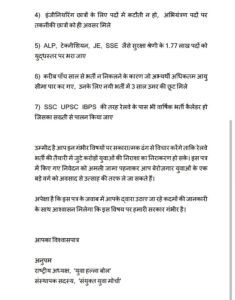 इतनी भारी संख्या में रेलवे जैसे अहम विभाग में पद खाली होने के बावजूद मार्च 2019 के बाद से सरकार द्वारा एक भी भर्ती नहीं निकालना हमें विचलित करता है। पिछले लोकसभा चुनाव से ठीक पहले आयी एनटीपीसी और ग्रुप-डी की भर्तियों को साढ़े चार साल हो गए। उस वक्त आपकी सरकार ने चुनाव से ठीक पहले यह वादा किया था कि रेलवे के जरिए अगले दो साल में चार लाख नौकरियां दी जाएंगी। लेकिन यह देख कर अत्यंत दुख होता है कि वादे के उलट नयी सरकार में कोई भर्ती ही नहीं निकाली गयी।