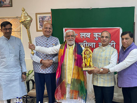 इस अवसर पर लीला कमेटी के सीनियर वाइस प्रेजिडेंट सत्यभूषण जैन, बीपी टंडन, ने मंत्री महोदय को शक्ति की प्रतीक गदा, तीर कमान, और शॉल भेंट करके उनका स्वागत किया।