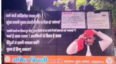 पोस्टर में लिखा है कि शर्म करो अखिलेश यादव। सवाल करते हुए लिखा गया है कि खूंखार अपराधी मुख्तार अंसारी की मौत पर आप संवेदना जता रहे हैं, लेकिन आतंकवादी हमले का शिकार हुए हिंदू युवक शुभम के घर जाने में आपकी भावनाएं क्यों खत्म हो गईं? फर्क है साफ शायद! आतंकियों से रिश्ता है खास. हिंदुओं से इतनी नफरत क्यों हैं? पूछता है हिंदू समाज?